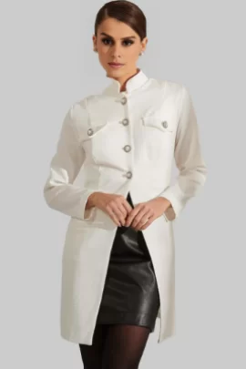 O jaleco feminino off-white com manga longa e gancho é perfeito para um look clássico e elegante. A gola redonda Amanda e o tecido de alta qualidade proporcionam um visual moderno e confortável.